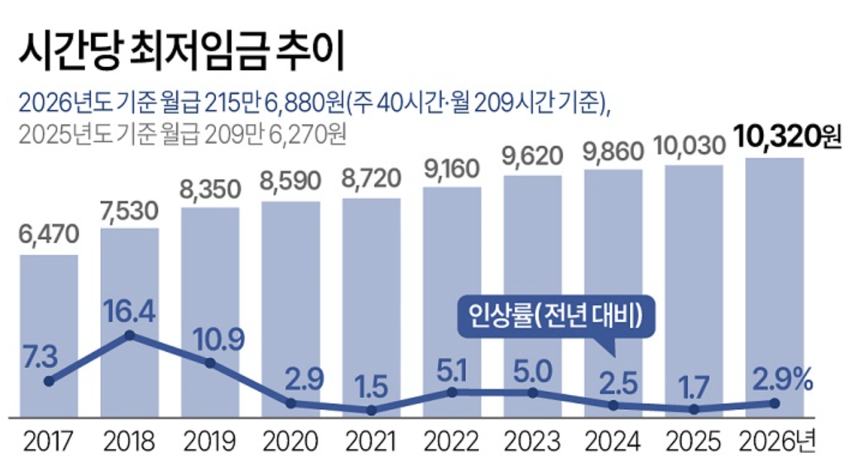 2026년부터 적용될 최저임금이 시간당 1만 320원으로 확정됐습니다. 이는 2025년 최저임금인 1만 30원보다 290원 인상된 금액이며, 인상률로는 2.9%에 해당합니다. 이 인상폭은 지난 2024년의 1.7%, 2021년의 1.5%보다 높은 수준이지만, 여전히 저임금 노동자들의 체감 수준에는 못 미친다는 지적도 나오고 있습니다.