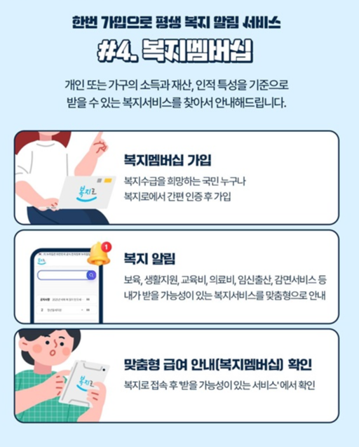 생애주기별 맞춤 안내를 받을 수 있도록 복지멤버십 제도를 운영하고 있습니다
