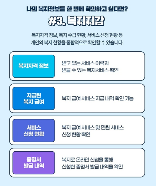 *복지자격 정보: 본인이 현재 수급 자격이 있는 복지서비스 목록과 과거 수급 이력을 확인할 수 있습니다.