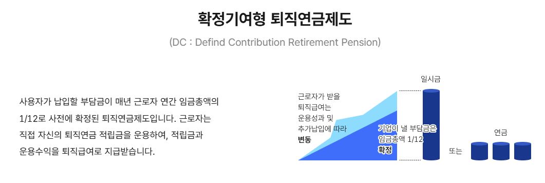 회사가 매년 일정 금액을 근로자의 퇴직연금 계좌에 납입하고, 근로자가 직접 운용한다. 수익률에 따라 수령 금액이 달라지며, 투자성과에 대한 책임은 근로자에게 있다.