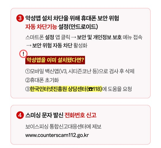 스미싱 피해는 단순히 개인정보 유출에 그치지 않고, 여러 방식으로 2차 피해로 이어질 수 있다. 만약 악성앱이 설치되었다면, 모바일 백신으로 검사 후 해당 앱을 제거해야 하며, 필요시 기기를 초기화하는 것이 좋다. 초기화는 모든 데이터를 삭제하는 조치로, 전문가의 안내를 받아 신중하게 진행해야 한다.