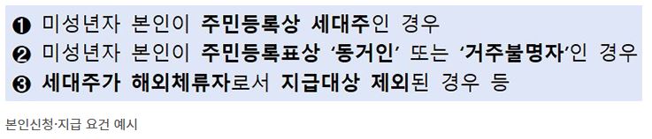 (4) 미성년자와 세대주가 동일 주소지에 거주하지 않는 경우에도, 세대주가 동일 세대원으로 등록돼 있다면 신청 및 수령이 가능.