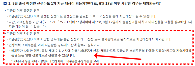 한편, 기준일인 6월 18일 이후 사망한 경우에는 본인 및 대리 신청 모두 불가능하며, 원칙적으로 지급 대상에서 제외됩니다. 만약 소비쿠폰이 이미 지급된 상태에서 사망했다면, 사용하지 않은 잔액은 환수됩니다.