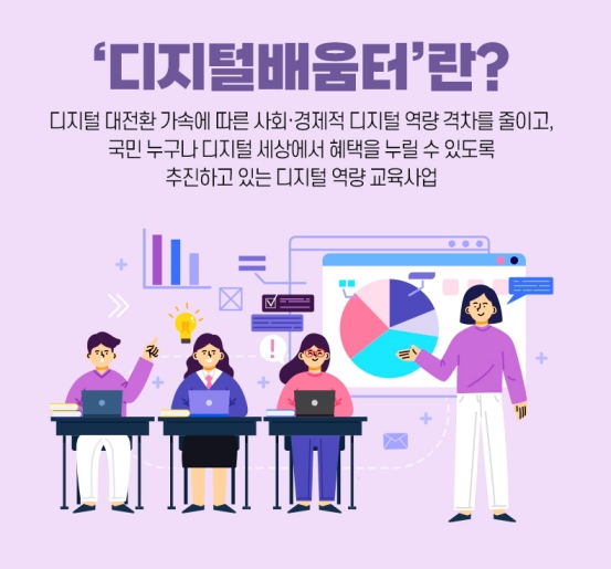과학기술정보통신부에서는 디지털배움터 거점센터를 운영하고 있습니다. 디지털배움터 거점센터는 디지털 환경에 익숙하지 않은 국민 누구나 디지털 역량을 기를 수 있도록 연중 상시로 교육을 제공하는 정책 사업입니다.
