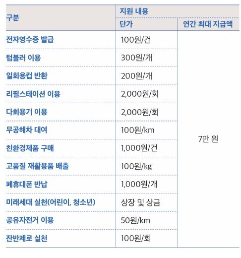 텀블러 사용, 전자영수증 선택, 다회용기 이용 등 작지만 의미 있는 행동으로 연간 최대 7만 원까지 보상받으면서, 미래 세대를 위한 깨끗한 지구를 함께 만들어 가는 길에 동참하시기 바랍니다.