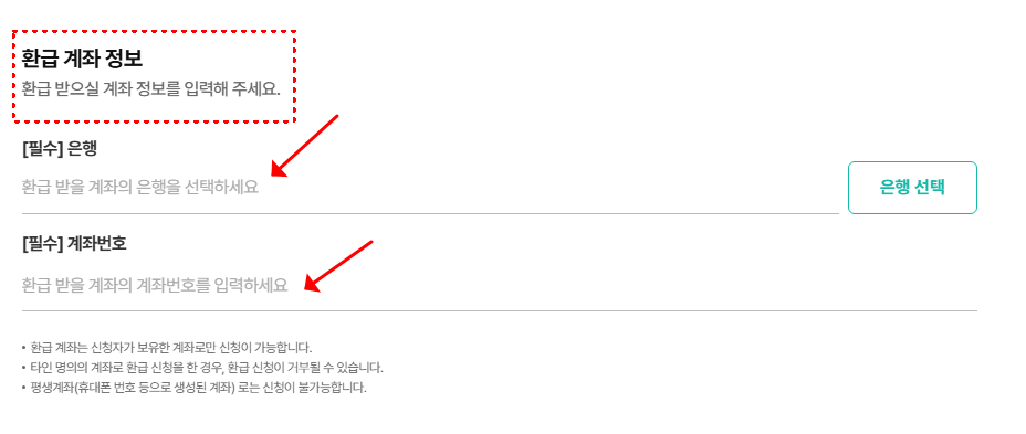 이때 입력해야 하는 정보는 은행명, 계좌번호, 예금주 이름이며, 반드시 신청자 본인의 명의로 된 국내 계좌여야만 정상 처리됩니다.