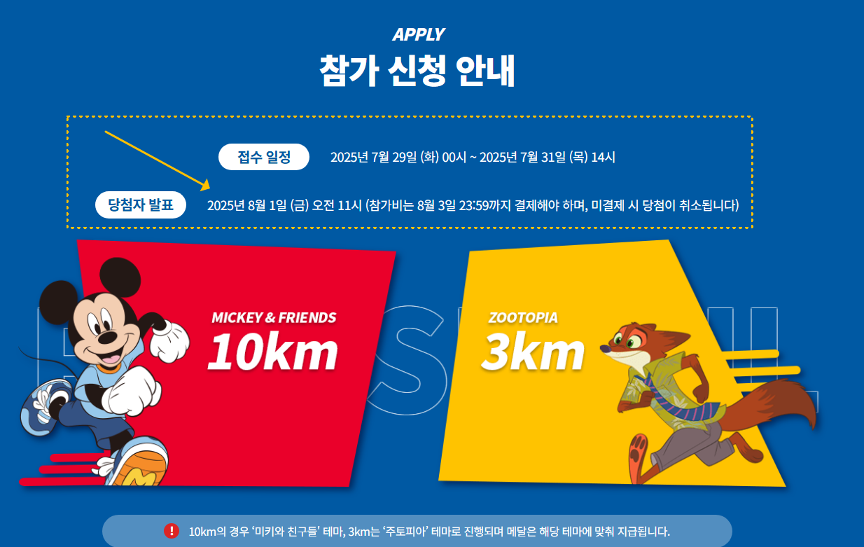 단 3일간의 짧은 기간 동안만 접수가 가능하므로, 늦지 않게 신청하는 것이 중요하다. 신청은 디즈니런 공식 홈페이지를 통해서만 가능하며, 홈페이지 내 접수 양식을 작성하고 선호하는 코스를 선택하면 된다.