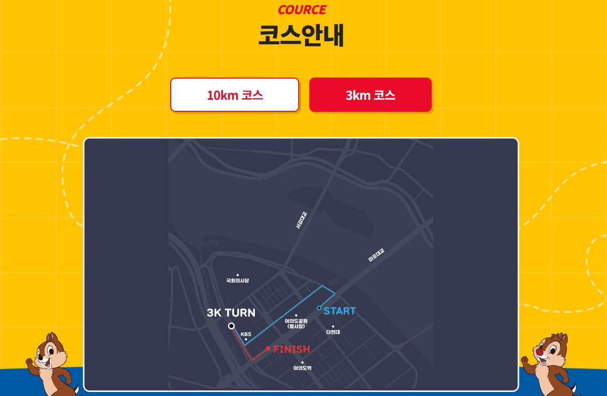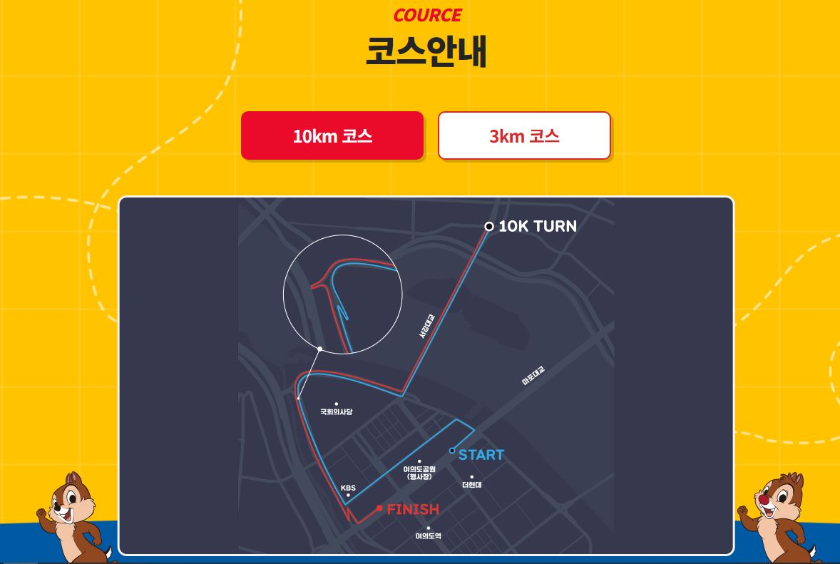 10km 코스는 서울 도심 속을 누비는 듯한 경쾌한 구성으로 설계되었고, 다양한 캐릭터 조형물과 그래픽 장치들이 설치되어 있어 러닝 도중에도 시각적인 즐거움을 느낄 수 있다. 무엇보다 기록 이외에도 뿌듯한 성취감을 느끼기에 충분한 거리로, 운동과 디즈니를 동시에 사랑하는 사람에게 딱 맞는 코스다.