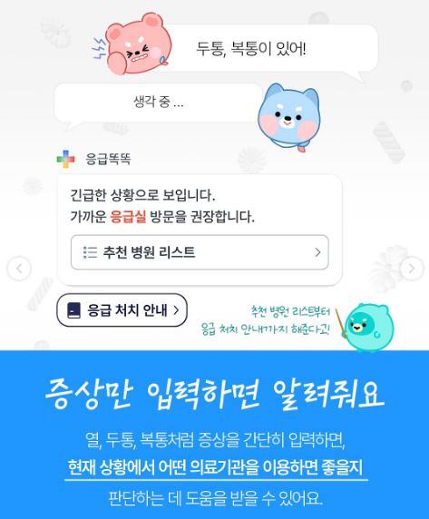 아이안심톡과 연계되어 함께 시범 운영되는 응급똑똑 앱은 사용자 맞춤형 의료기관 안내 서비스입니다. 이 앱은 보호자가 입력한 증상 정보를 바탕으로, 중증도에 따른 병원 이용 방향을 제시하고 실시간 의료기관 정보를 제공합니다.