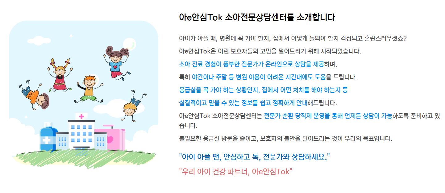 아이가 아플 때 병원 갈지 고민되시나요? 아e안심Tok을 이용해 보세요. 아이안심톡, 아e안심Tok, 소아전문상담센터