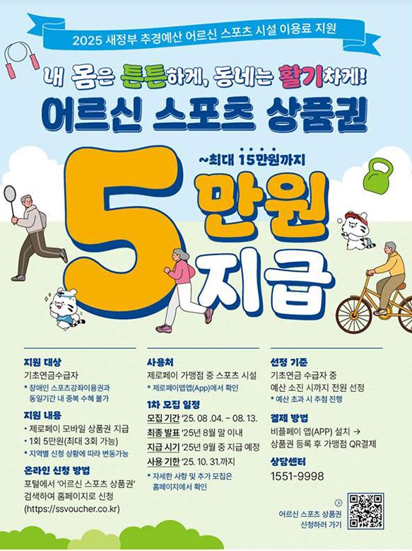 총 사업비는 365억 원, 국비 260억 원, 지방비 105억 원으로 구성되어 있고, 상품권은 총 70만 장이 배포됩니다. 1장당 5만 원 상당이며, 최대 15만 원까지 지원되니 실제로 체육시설 이용료 부담이 크게 줄어듭니다. 이는 체육시설을 단순한 운동공간이 아닌, 어르신들의 여가활동과 사회적 소통의 거점으로 활용하게 되는 계기가 될 수 있습니다.