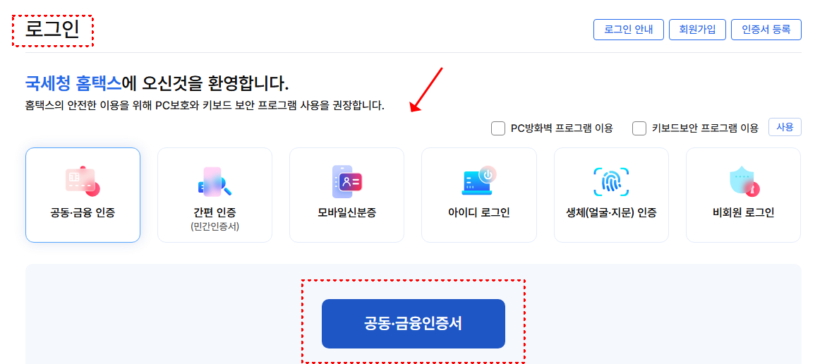 (2) 공동인증서 또는 간편인증 방식을 통해 로그인합니다.