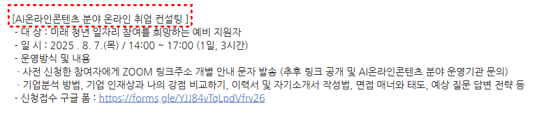 8월 7일 목요일 오후 2시부터 5시까지 총 3시간 동안 Zoom을 통해 진행되는 이 프로그램은, 사전 신청자에 한해 참여 링크가 개별 발송됩니다. 해당 컨설팅은 기업 분석법, 이력서 및 자기소개서 작성 전략, 면접 시 주의사항 등 실전에서 필요한 취업 기술을 집중적으로 다루는 과정입니다. 온라인 환경이지만 실질적이고 구체적인 팁을 제공하므로, 이 분야에 지원하는 모든 예비 참여자에게 큰 도움이 될 수 있습니다.