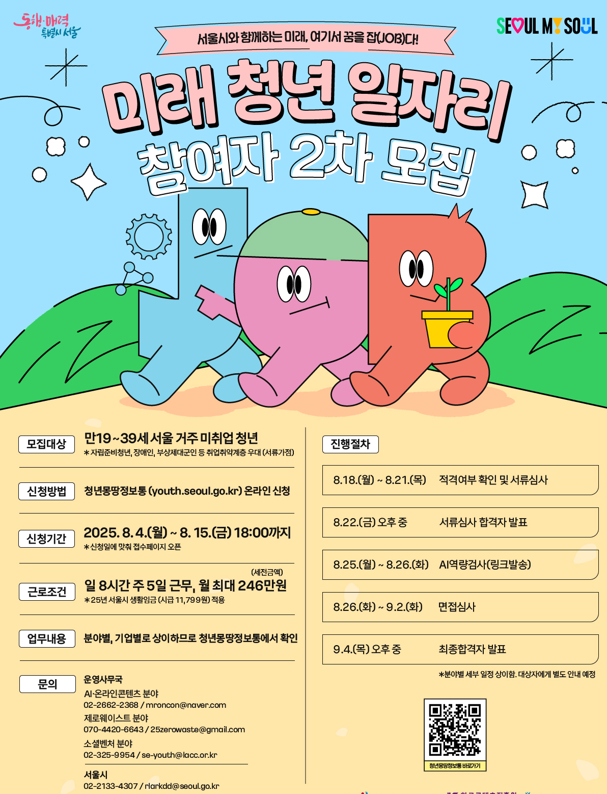 오늘은 서울시에서 청년을 대상으로 추진 중인 2025년 미래 청년 일자리 사업 2차 참여자 모집에 대한 정보를 소개해드리려고 합니다.