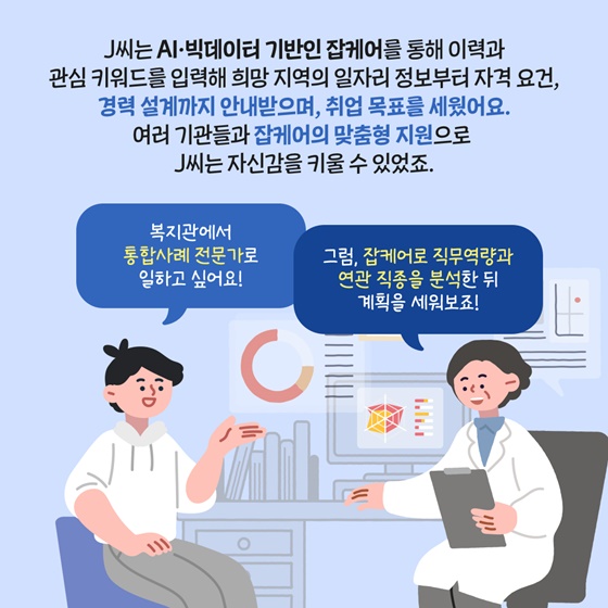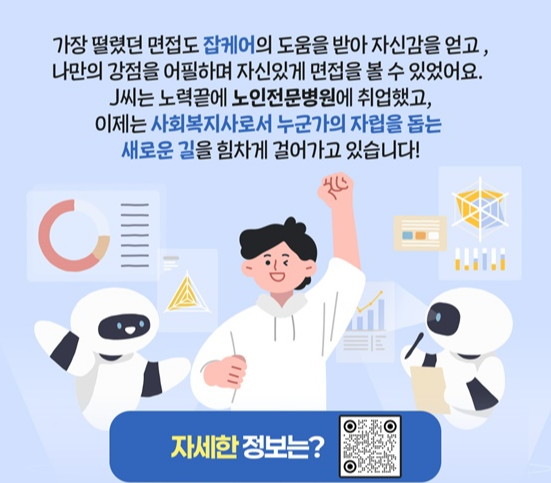 이 서비스는 기존의 일자리 추천과 달리 사용자의 구체적인 경력 상황과 지역 선호, 업종 관심도 등을 종합 분석하여 일자리 정보를 제공합니다. 예를 들어, 사회복지사로 진로를 고민하던 한 이용자는 잡케어를 통해 관심 직무와 관련된 병원 채용 정보, 필요한 자격 요건, 관련 훈련 과정을 모두 안내받을 수 있었습니다. 이를 바탕으로 준비를 해 사회복지사로 실제 취업에 성공하는 성과도 나타났습니다.