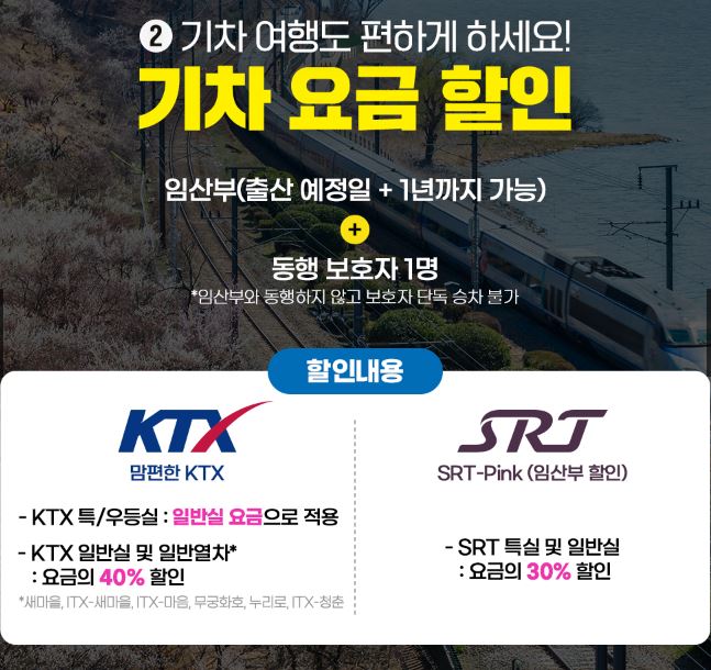 할인율은 열차 종류에 따라 다르지만, 대부분의 경우 운임의 40%가 할인됩니다. 과거에는 임산부가 특실만 이용할 수 있어 비용 부담이 컸던 반면, 이제는 일반실을 포함한 다양한 열차에서 할인 혜택을 받을 수 있어 이동의 자유도가 한층 높아졌습니다.