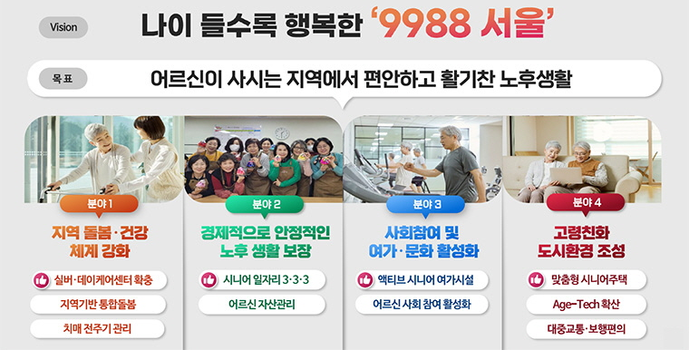 서울시는 고령화라는 사회적 과제를 단지 부담이 아닌 기회로 바라보고, 어르신이 삶의 주체로서 존엄하고 활기차게 살아갈 수 있는 기반 마련에 나서고 있습니다. 9988 서울 프로젝트는 단순한 일자리 창출 사업이 아니라, 복지·문화·주거·건강을 아우르는 전방위적 고령사회 대응 전략입니다.