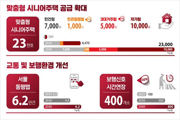 서울시는 일자리 정책 외에도 주거, 돌봄, 문화생활까지 포함한 전방위적 복지정책을 병행 추진합니다. 우선 어르신 전용 주택 2만5천 가구가 2040년까지 공급될 예정이며, 이 중 자가 거주 어르신을 대상으로 하는 자가형 시니어주택 개조 사업도 병행됩니다. 이 사업은 화장실 안전손잡이, 높낮이 조절이 가능한 싱크대 등 주거환경을 시니어 맞춤형으로 개선하는 것을 핵심으로 하며, 최대 1만 가구까지 확대 적용됩니다.