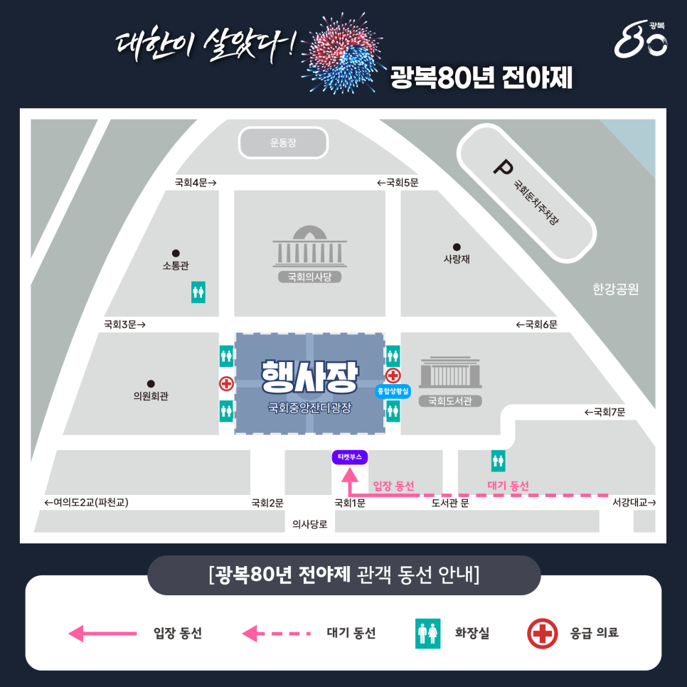 또한, 전야제 시작 전에는 국회 경내에 조성된 독립기억광장의 제막식이 진행됩니다. 이 공간은 이름 없이 조국을 위해 헌신한 무명의 독립유공자들을 기리는 상징적인 장소로, 광복 80주년에 맞춰 국민들에게 공개됩니다.