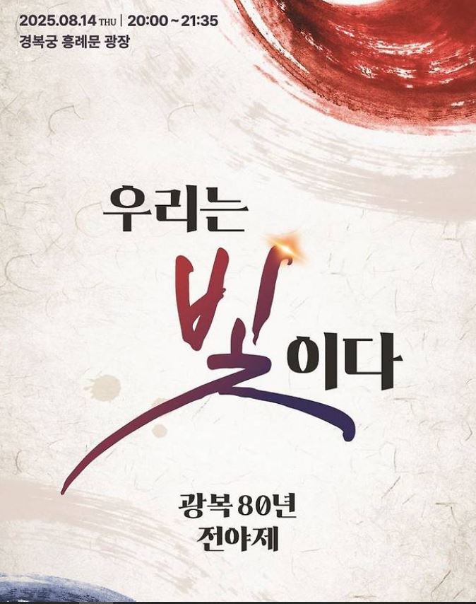 문화체육관광부는 8월 14일 저녁 8시, 경복궁 흥례문광장에서 광복 80년 전야제 우리는 빛이다를 개최합니다. 이번 전야제의 주제인 우리는 빛이다는 지난 80년 동안 대한민국을 만들어 온 국민 모두가 그 자체로 빛이었다는 의미와, 앞으로 다가올 80년 또한 함께 밝혀가자는 희망의 메시지를 담고 있습니다.