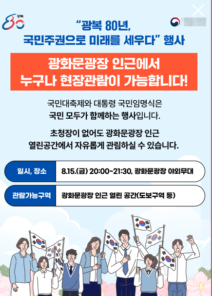 참여를 원하는 국민은 8월 7일 오후 8시 15분부터 네이버 예매를 통해 모바일 사전 입장권을 신청하면 됩니다. 무료 예매이지만 좌석이 한정되어 있어 빠른 신청이 필요합니다. 예매가 완료되면 행사 당일 현장에서 모바일 입장권을 제시해 입장할 수 있습니다.