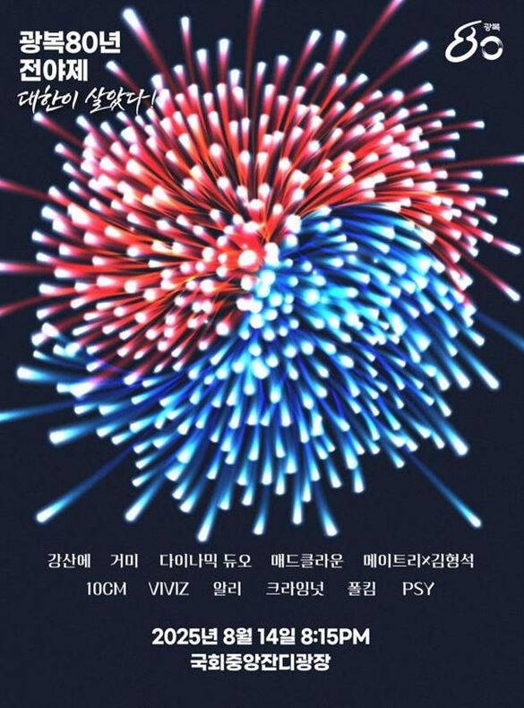 대한이 살았다! 전야제의 공연 라인업은 세대와 장르를 초월합니다. 강산에, 거미, 다이나믹 듀오, 매드클라운, 메이트리X김형석, 10CM, VIVIZ(비비지), 알리, 크라잉넛, 폴킴, 그리고 PSY(싸이)가 무대에 오릅니다. 록, 발라드, 힙합, 아카펠라 등 다양한 장르의 음악이 한자리에 모여, 광복의 밤을 뜨겁게 달굴 예정입니다. 각 아티스트는 광복의 의미를 담아 특별히 준비한 무대를 선보이며, 관객에게 음악과 함께 감동을 전합니다.
