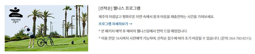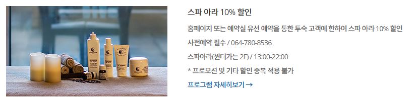 또한 리조트 내 식음료 업장과 스파에서 10% 할인 혜택을 받을 수 있습니다. 체크인 시 제공되는 제주 화산암 차와 다과로 구성된 웰컴 티 세트는 여행의 시작을 더욱 특별하게 만들어 줍니다.