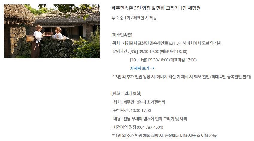 이곳에서는 제주 사람들의 생활상과 역사, 그리고 지역의 특색 있는 건축양식을 원형 그대로 만나볼 수 있습니다. 특히 초가 갤러리에서 진행되는 민화 그리기 체험권(1인)은 가족 단위 여행객이나 문화 체험을 선호하는 이들에게 인기 있는 프로그램입니다.