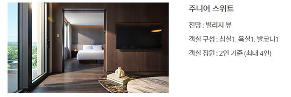 숙박은 최대 4인까지 투숙 가능한 주니어 스위트 객실 1박이 기본으로 제공됩니다. 객실에서는 탁 트인 바다 전망과 함께 편안한 휴식을 취할 수 있으며, 실내외 수영장과 피트니스 센터 이용도 가능합니다.
