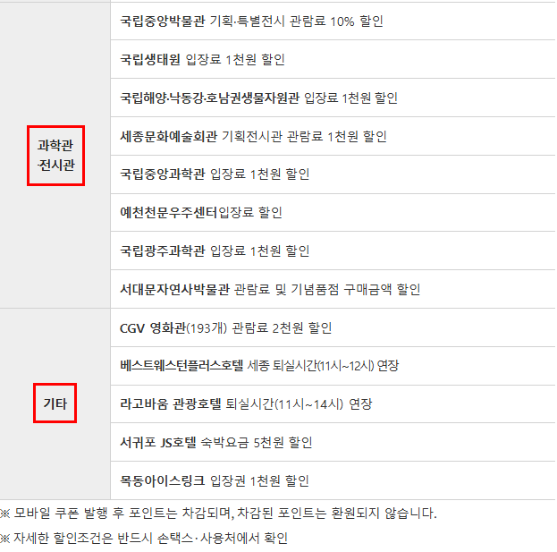 서울 지역에서는 서대문자연사박물관과 목동 아이스링크가 대표적인 사용처입니다. 서대문자연사박물관에서는 관람료가 2,000원 할인되고, 기념품 구매 시 최대 1만 원까지 추가 할인을 받을 수 있습니다. 목동 아이스링크에서는 입장권을 1,000원 할인받을 수 있어, 가족 나들이나 데이트 코스에서 유용하게 활용할 수 있습니다.
