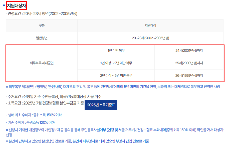 2025년부터 새롭게 도입된 의무복무 제대군인 연령 가산 제도는 군 복무로 인해 신청 자격 연령을 초과한 청년들에게도 기회를 제공하는 특별한 제도입니다. 군 복무 기간에 따라 최대 3년까지 연령이 가산되어 신청 가능 연령이 확대됩니다. 2년 이상 5년 미만 복무자는 1999년생까지, 1년 이상 2년 미만 복무자는 2000년생까지, 1년 미만 복무자는 2001년생까지 신청할 수 있습니다.